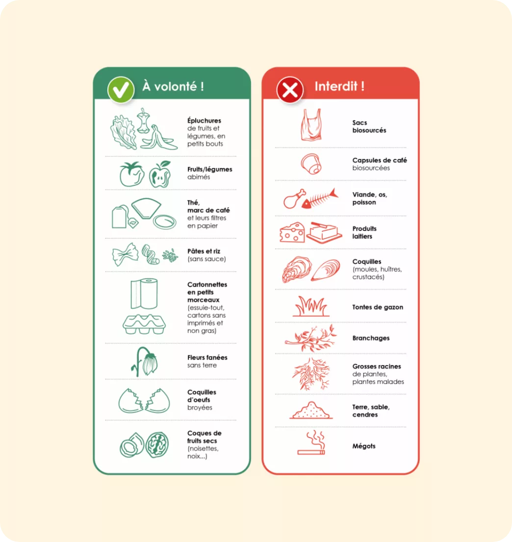 Non : viande, poisson, produits laitiers, restes gras, sacs compostables, grandes quantités d’agrumes.
